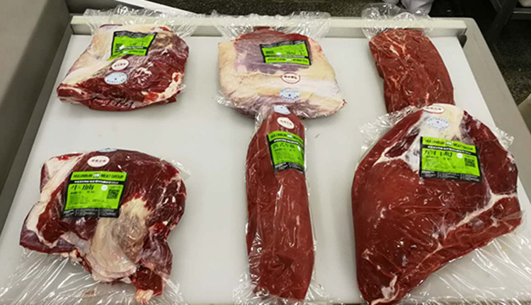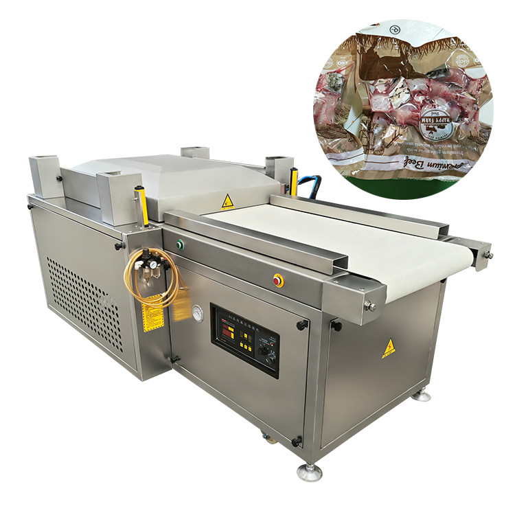 橫向滾動真空包裝(zhuāng)機是(shì)在普通包裝機基礎上開發的一種自動化程(chéng)度較高的設備。人(rén)工在(zài)擺料區放好(hǎo)物品後,輸送(sòng)帶自動會把(bǎ)物料(liào)輸送到工作室,工作室(shì)會自動下降,完成真空、封口。然後工作室上(shàng)升,包裝好的物品會自動輸送出去,具有省工、省力(lì)、工作效率高的優點,特別適合包裝(zhuāng)大塊牛羊肉。下料區可以連接熱縮(suō)機。